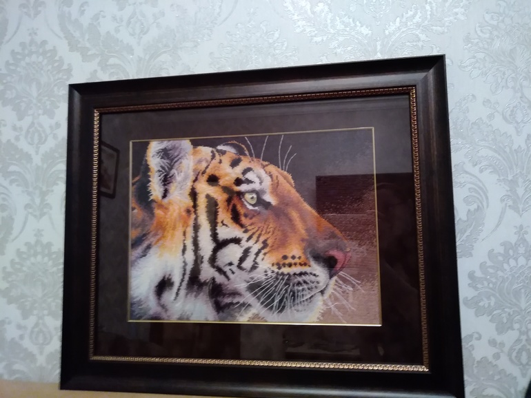 Ух ты.....тигр какой красивущий, величественный такой и одежка ему очень идет, в реальности бархатное паспарту еще лучше смотрится наверняка, фото все-равно не передает всей красоты и котенок - симпатяга!