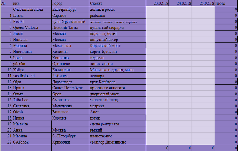 Игра "Вышивальный забег"Всем привет! Я наконец=то с компом, но возникла одна техническая неприятность...Я кое как восстановила доступ к гугл аккаунту, чтобы создавать таблички((( Но у меня все получилось и к игре я готова.В этот раз нас 22 человека, готовых пробежаться, несмотря на праздник и домашние хлопоты. Я сама сегодня весь день чем то занималась только не вышивкой. Во первых утром сбегала с собакой погуляла, купила тематических шариков и съездила за любимой пиццей мужа, потом пока ребенок спал мы с мужем пробежались по магазинам строительным и мебельным, зашли за продуктами и я засела лепить пельмени))) А как у вас прошел этот день? как поздравили своих мужчин?