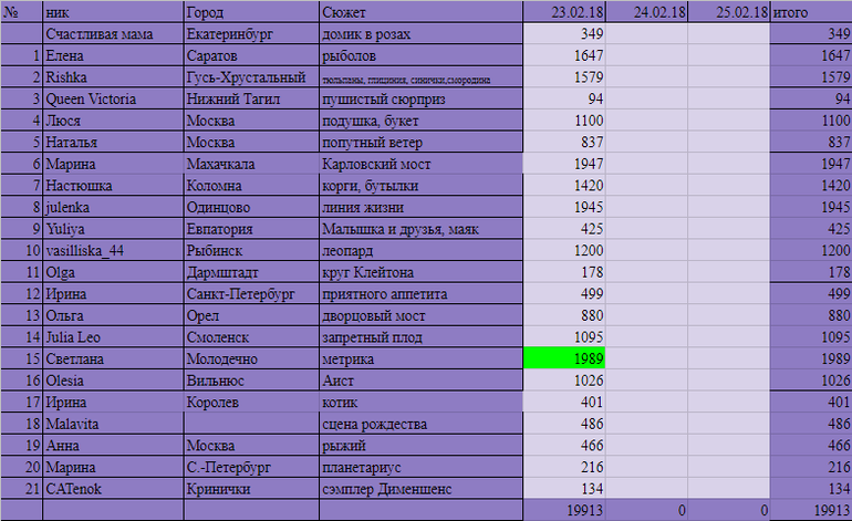 Игра "Вышивальный забег"И снова здравствуйте! Несмотря на праздник, мы все большие молодцы - за день нами вышито 19913 крестиков! Лидером дня стала Светлана с результатом 1989 крестиков, а за ней плотно бегут Марина из Махачкалы с результатом 1947 крестиков и всего на 2 крестика от нее отстает julenka.