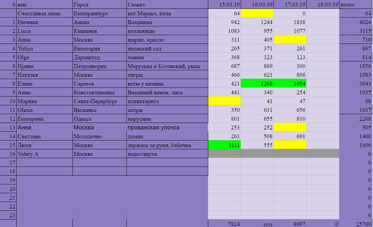 Игра "Вышивальный забег"Всем привет! Ну вот и финишная прямая))) Как обычно напишу про итоги дня. Лидером дня снова стала Елена с результатом 1954 крестика, но сегодня ей на пятки наступает Евгения с результатом 1838 крестиков, ну и немного сдала позиции Lucia замыкает тройку лидеров с результатом 1077 крестиков