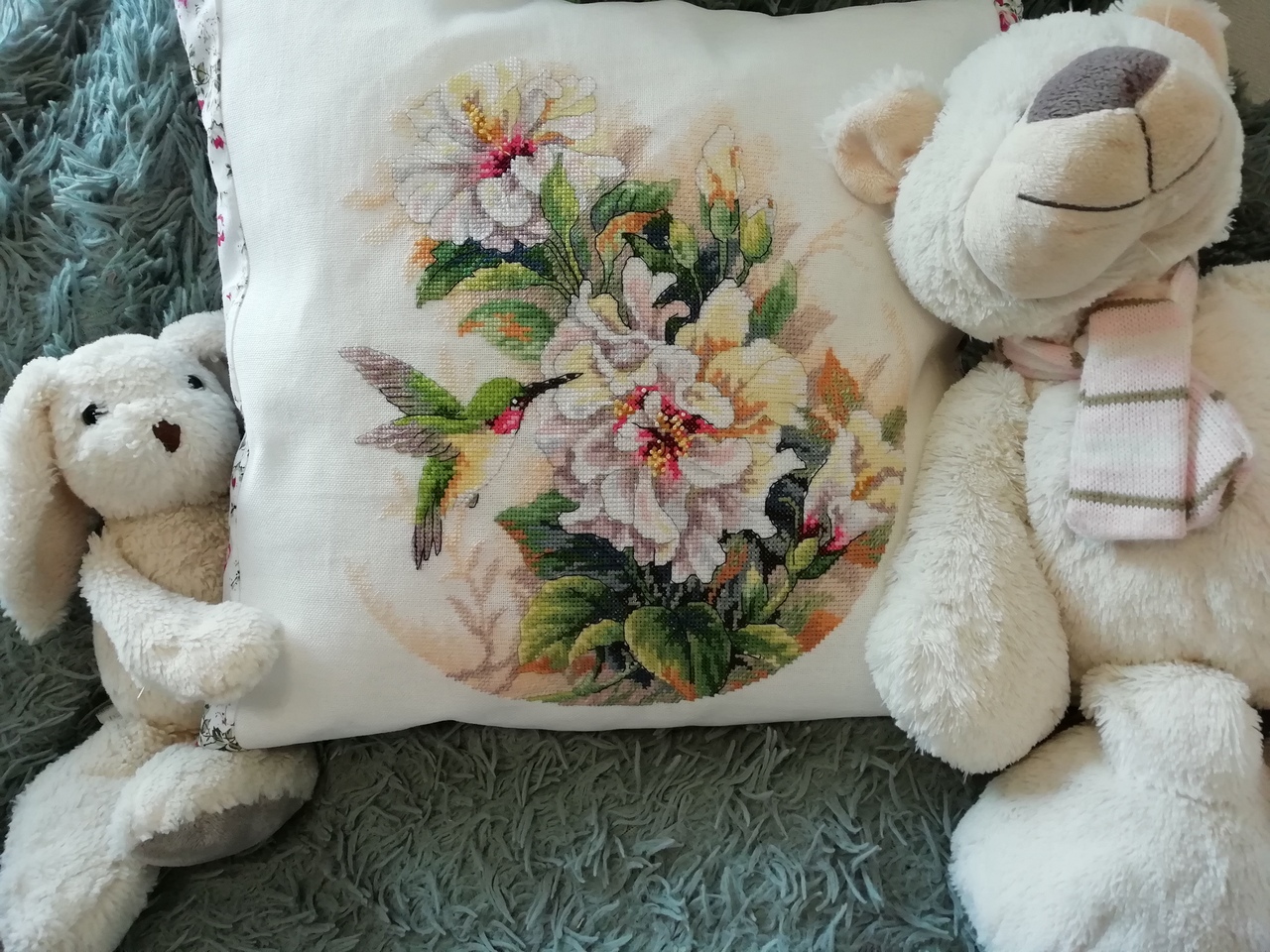 Венок с колибри был вышит ооочень давно и ждал... ждал непонятно чего. В багет я его не хотела, были мысли о салфетке... но как-то не срослось. И в итоге получилась наволочка: