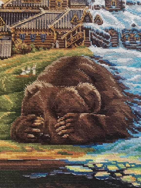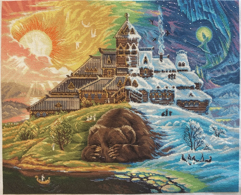 Сначала о наборе: называется "Пробуждение", производитель "Панна", 64 тыс. крестиков (полная зашивка) плюс бэк и фрузелки, размер 44,5 на 36,5 см, 16-я белая аида, 52 цвета + 14 блендов.