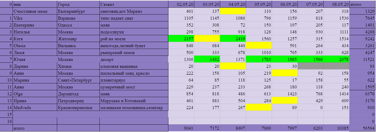 Игра "Вышивальный забег"Всем привет! Вот и финиш. Вы все такие молодцы! Сначала о лидерах дня. Снова во главе Юлия с результатом 2078 крестиков, за ней бежит Vika с результатом 1536 крестиков и на 3 месте уступив Вике всего 2 крестика Катя - 1534 крестика. Сегодня у нас рекорд - 10385 крестиков!