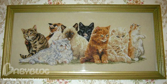 Я обожаю кошек и все, что с ними связано. Поэтому и вышила их с удовольствием, не смотря на черно-белую мелкую схему. Вот они мои хорошие: