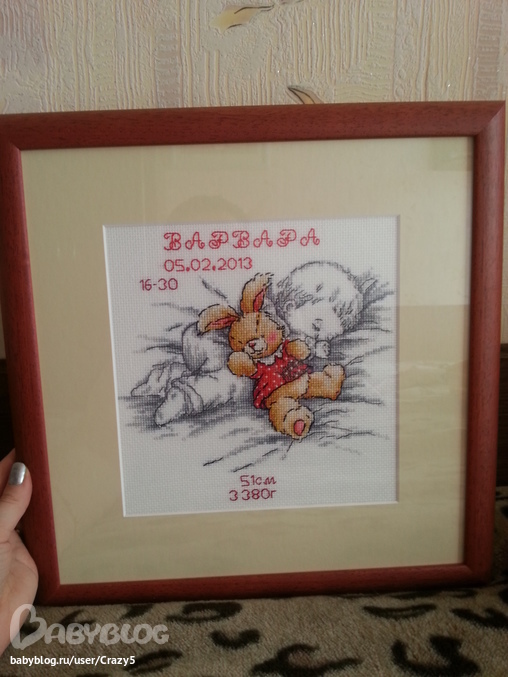 Я сначала метрику в подарок сделала, а потом в оформлении так понравилось, что я ринулась к 8 марта долгострой добивать)))