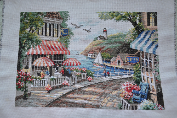 Ну и покажу недавно законченную работу, тоже от Дим - "Кафе у моря". Вышивалась в рамках игры Раунд Робин, спасибо девочкам, которые участвовали