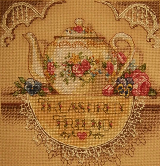 Машинка вышилась очень быстро (ха-ха, после Кандамаровского корабля мне уже ничего не страшно) за 2 недели, хотя шерстью шить не очень люблю. Чайник - многострадальный, вышивала его в час по чайной ложке, пока ждала дочку с занятий (2 часа раз в неделю). По-моему бэк на нем занял времени больше, чем сама вышивка. Хотела чашку сразу , но передумала)))))