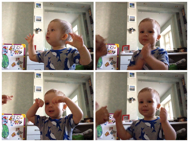 Митюшка с удовольствием делает все действия и говорит "по-ссоооо", "меммм".