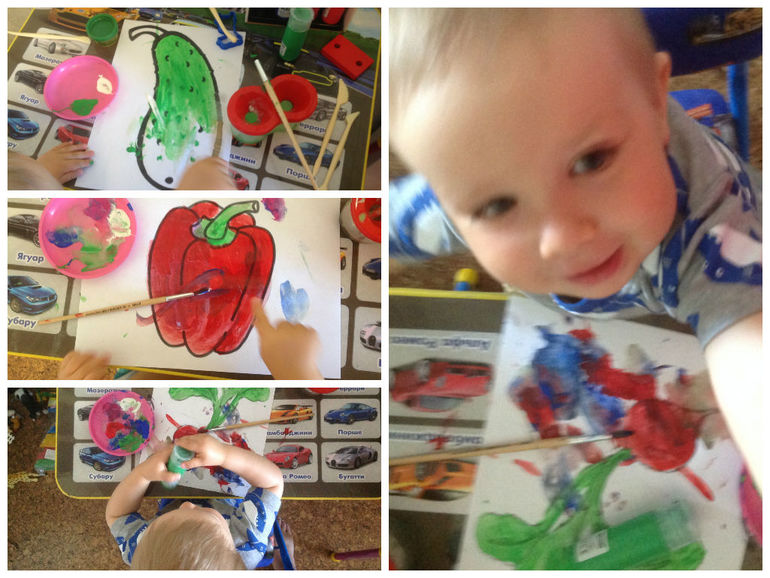 В течение всего времени, посвященному овощам, мы очень много рисовали, способ чаще всего был один: начинали с кисточки, заканчивали руками. Пока Мите нравится только этот способ, другие пробовать не хочет. Здесь можно скачать раскраски.