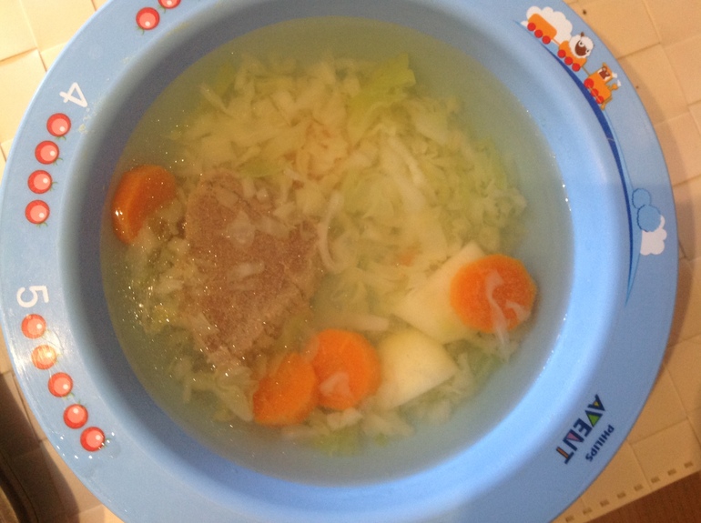 И, конечно, же мы вместе приготовили овощной супчик. Митюша по просьбе выбирал из корзины нужный овощ и приносил мне.