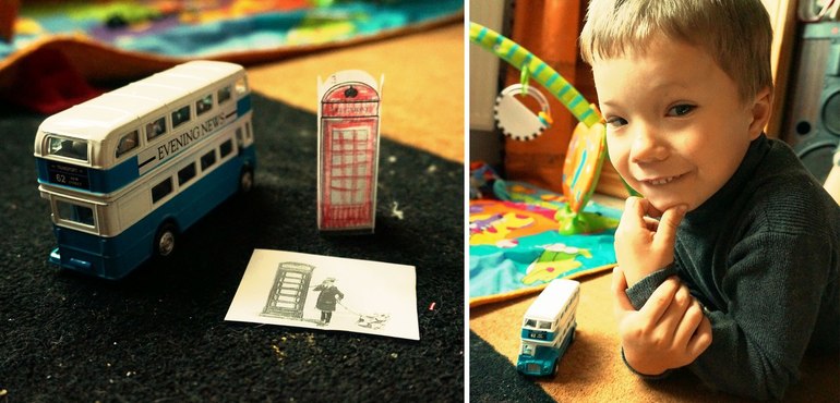 Чтобы заинтересовать и удержать внимание сына у нас появился двухэтажный лондонский туристический автобус. Я распечатала картинки с символами, достопримечательностями Великобритании. На автобусе Кирилл подъезжал к картинкам. Ну и как-то обыгрывали