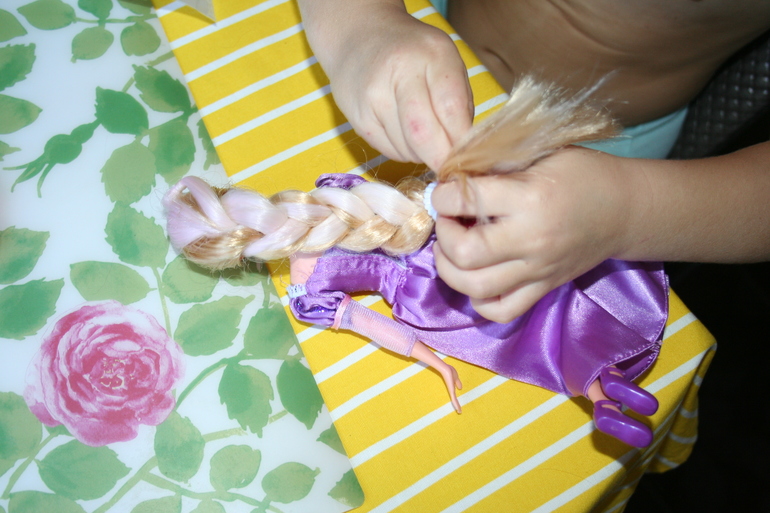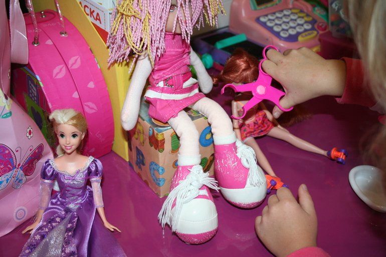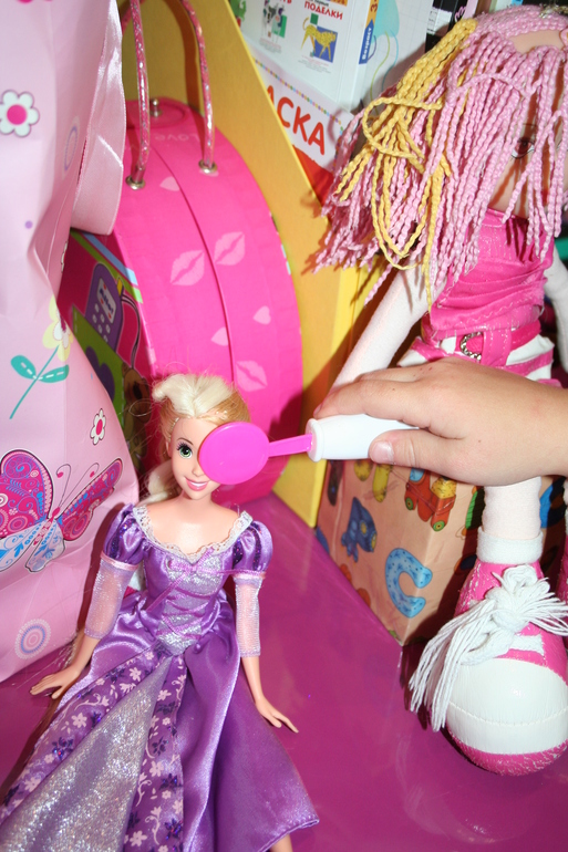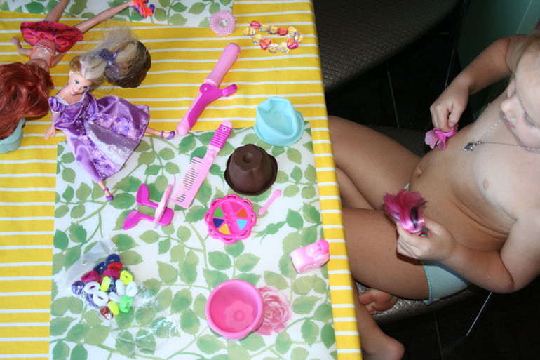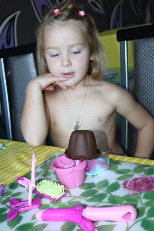 Камилла просто обожает игры в парикмахера, уже всех кукол подстригла, поэтому не удивительно, что все затеи Марины были восприняты ей на "ура"! Вот наш парикмахерский салон: