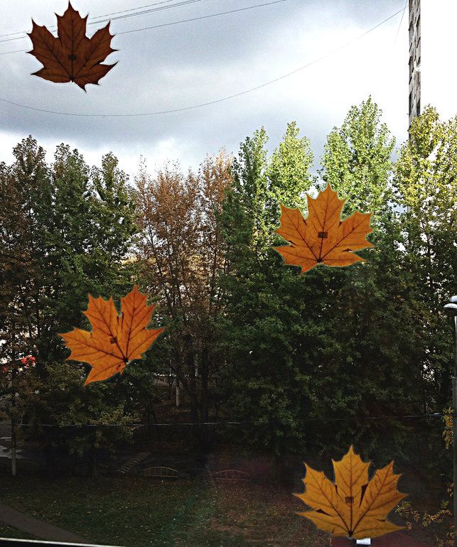 Ах, чуть не забыла) Украшали окна в осенней тематике) Листья клёна ламинировала, вырезала, клеила на двусторонний скотч.