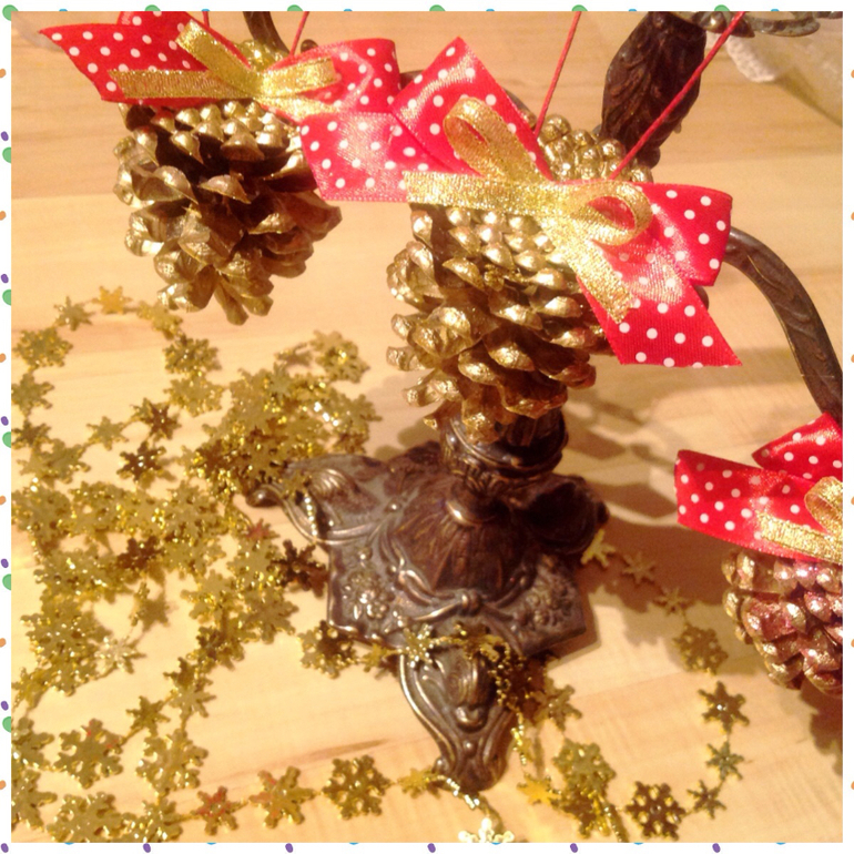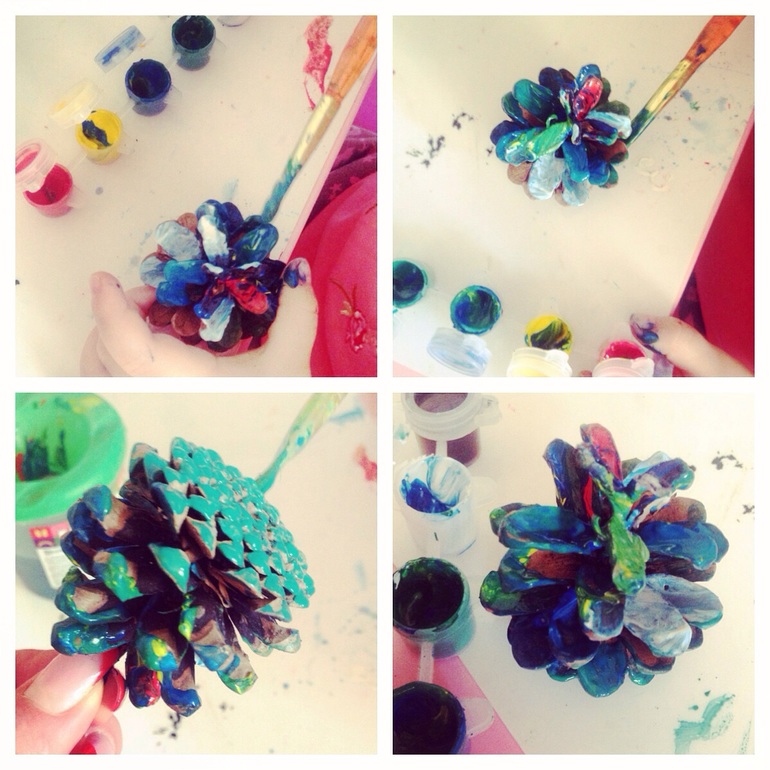 Нашли дома шишки, которые насобирали еще осенью. Мира декорировала свои шишки, а я свои.)