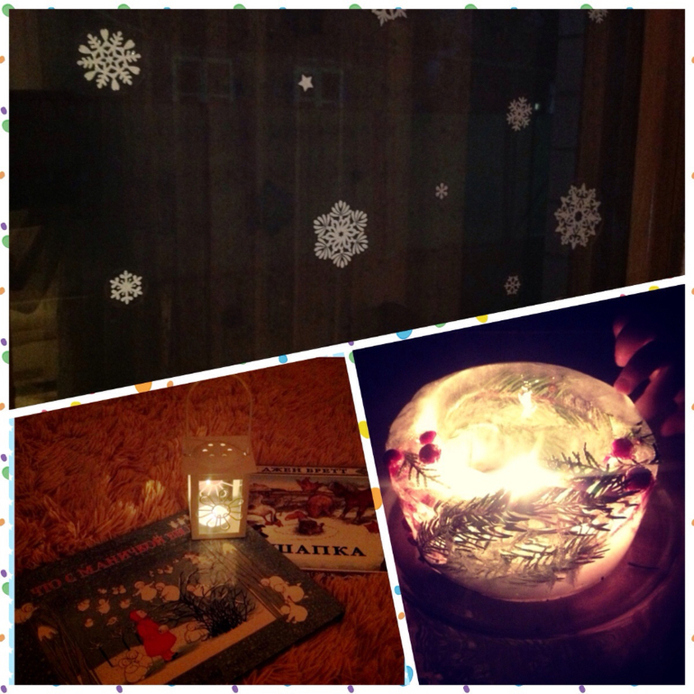 Читали книжки при свете нашего волшебного фонарика, очень уютно) И сделали ледяную лампу. На прогулке собрали немного еловых веточек и рябины и все это заморозили.