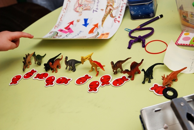 Квест с динозаврами. Собственно причиной была офигенная книга про динозавров, которую я не хотела выдавть просто так. Еще дядька наш в гостях у нас был, припрягла его рисовать. От каждого динозавра мы искали записочки с заданиями. На бумажке был стикер и у каждого динозавра был стикер соответствующего цвета, Миша переклеивал с задания на карту (в конце около каждого было по два). Ну так у нас была хоть какая-то связь с картой. А в конце мы-палеонтологи "откапывали" воображаемыми лопатами из-под дивана послание от динозавров - Книга энциклопедия древностей. Квест был супер, Миша надолго запомнил!