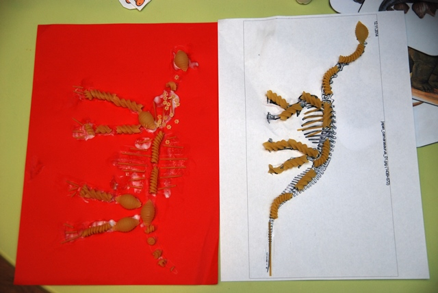 Сашулька с братишкой изучает)Карточки с динозаврами великолепные)Из макарон - здоровский скелет динозавра) Я Роське хотела человеческий сделать)