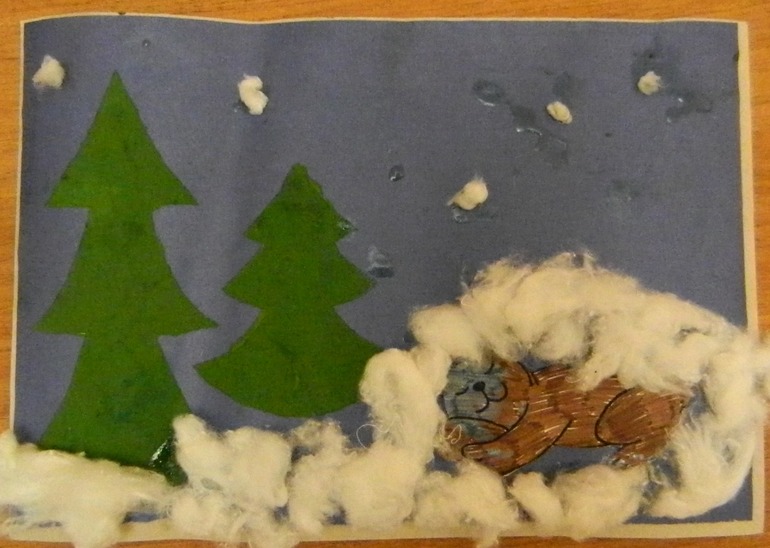 Уложили медвежонка спать. Заснеженная берлога из ваты, елочки нарисовали губкой через трафарет.