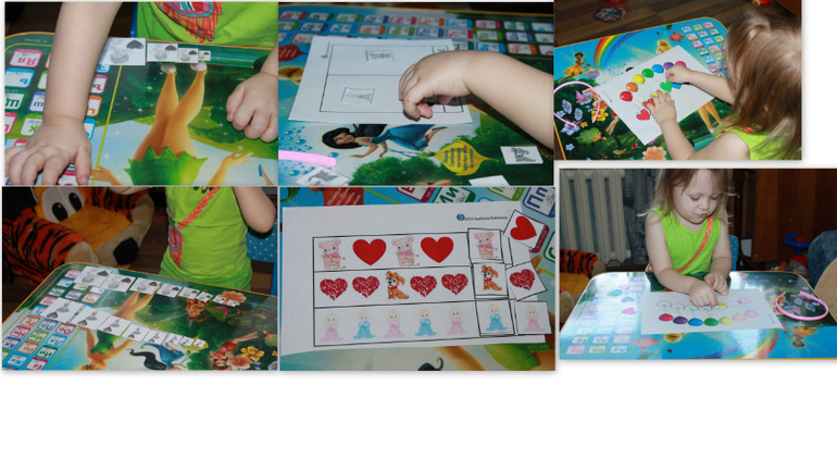 Сортировали по размеру, распределяли где люди где животные, продолжали логические ряды, подбирали сердечки по цветам шариков.