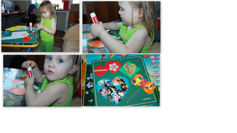 На следующий день мы поговорили о празднике посвященному этому замечательному чувству. Выяснили что в этот день принято дарить всем любимым валентинки. И принялись за их изготовление. Правда фото получилось мало, уж очень увлеклись. Старались делать разные, в процессе придумывая кому ее подарить.