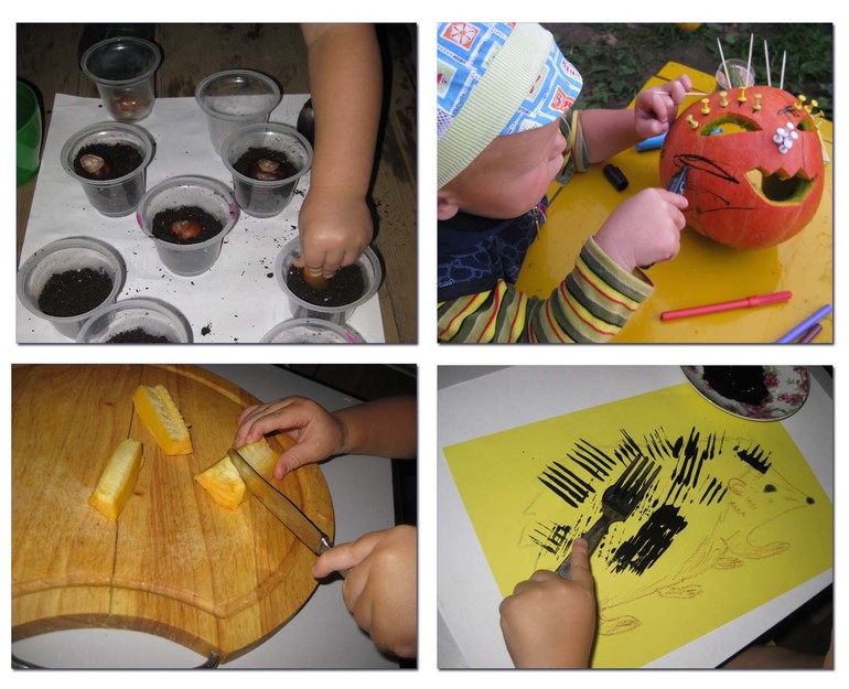 Сажали каштан и желуди (попытка оказалась неудачной). Тёмино оформление тыквенной головы и оттачивание навыка владеть ножом на её внутренностях. Рисование ежа с помощью вилки и гуаши.
