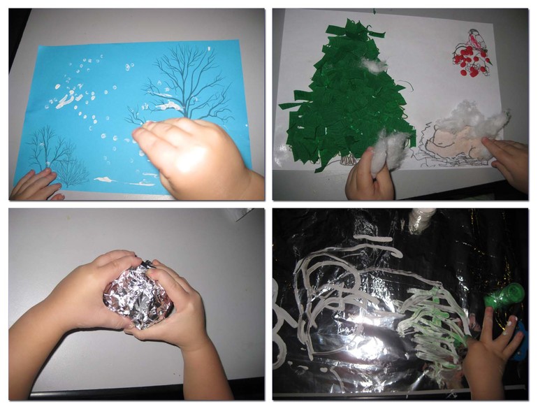 Аппликация «Снежок» ватными палочками и гуашью. Елочка и занесенная снегом берлога с помощью полосок бумаги и ваты. «Снежные комочки» из фольги. Рисование пальчиками на фольге (елка и снеговик).