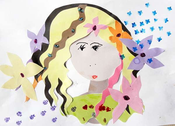 Заготовки - волосы, голову и цветочки я вырезала, Соня все склеила, нарисовала лицо и украсила штампами и блестками: