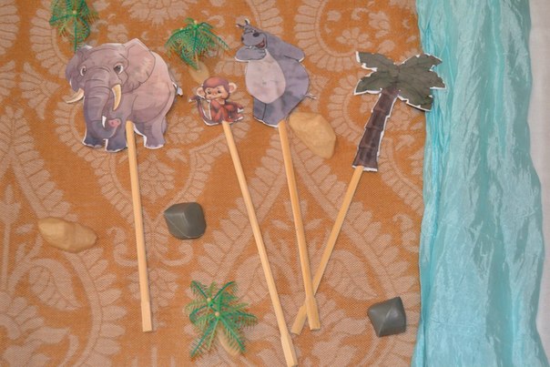 . И первый спектакль "Мама для мамонтенка". Я быстренько сделала шаблоны всех героев и наклеяла их на.... палочки для японской кухни (не зря я их копила))). Так как театра у нас нет, пришлось мастерить из подручных материалов.