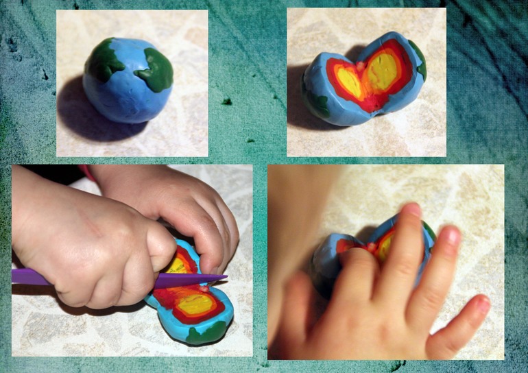Я слепила накануне макет Земли. Рассмотрели нашу планету, поговорили о том, что значит синий и зеленый цвет, разрезали ее. Когда Мира ее раскрыла, то сказала что внутри у нее солнышко. Так до сих пор всем и рассказывает)))
