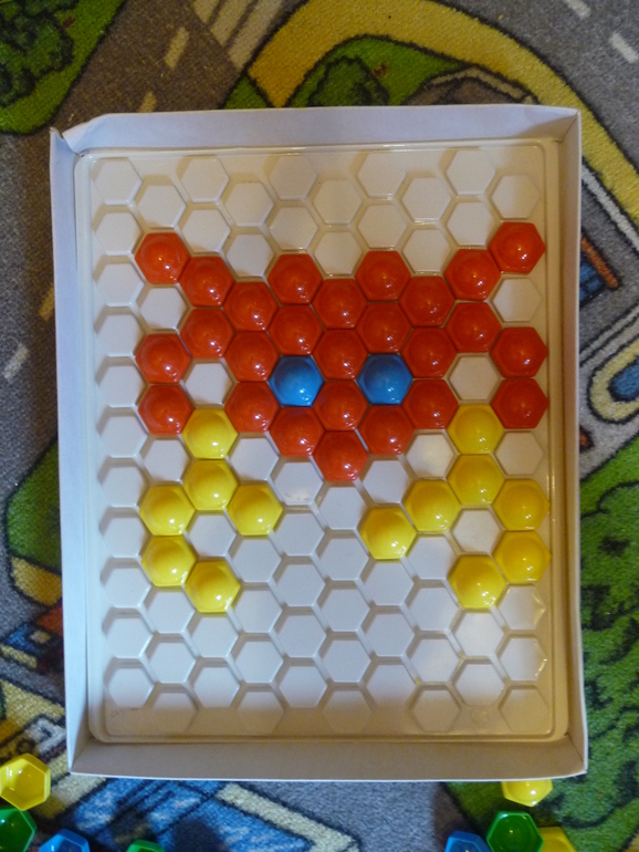Я предложила Ромке собрать из мозаики по схеме рыбку, но он сам придумал и сложил Краба.