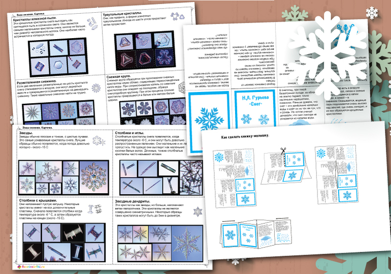 Книжка-малышка с рассказом о том, как появляются снежинки и какие они бывают. Карточки "Виды снежинок" с кратким описанием и наглядными изображениями.