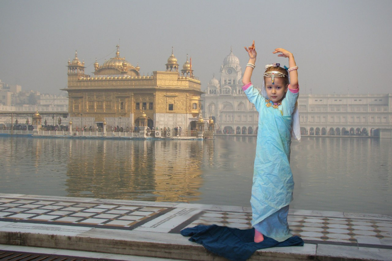 А это я уже развлекалась с графическим редактором, помещая старшую доченьку Киру то во дворец Махараджи, то к Золотому храму в Пенджаб, то просто на индийскую улицу :)
