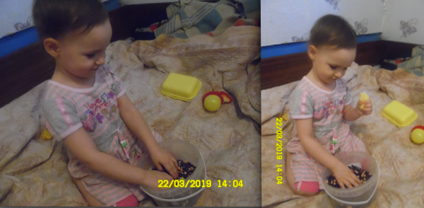 Ой, а наш цыпленок спрятался, давай его поищем в ведерке с фасолью и горохом. В ведерке у нас попрятались все кто смог, Алише очень понравилось. Заметка себе на будущее, использовать для данной игры более мелкие предметы и объем емкости увеличить, тогда будет посложнее.😉