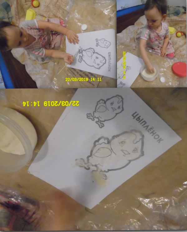 На изображение цыпленка нанесли клей, а потом посыпали манкой, встряхнув лишнее.