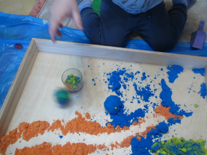 Конечно же тактильные игры: в песочнице и просто тактильные коробки.