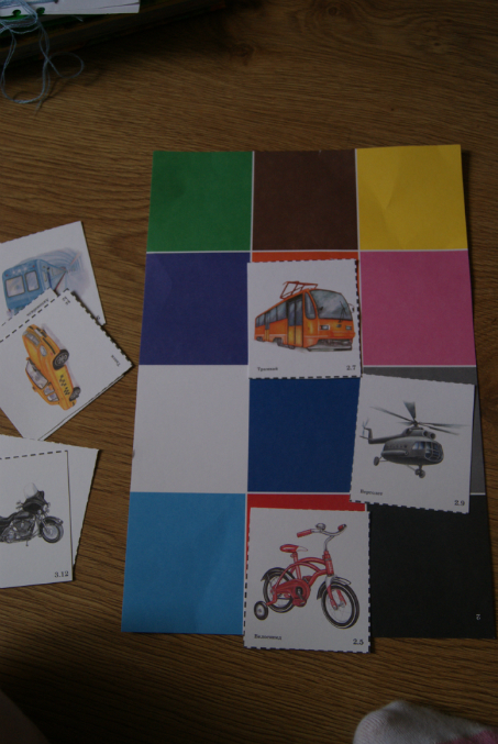 вот такие карточки из набора-собрать по цветам. ребенок не очень понял,что от него надо...