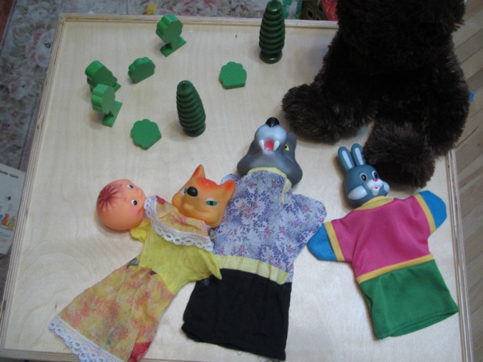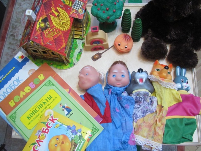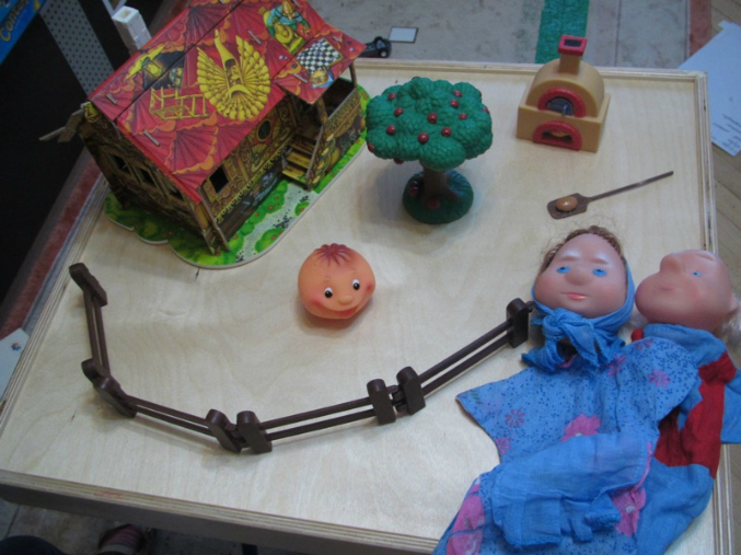 как видите декорации самые настоящие: и избушка, и колобок, и печка, и перчаточные куклы
