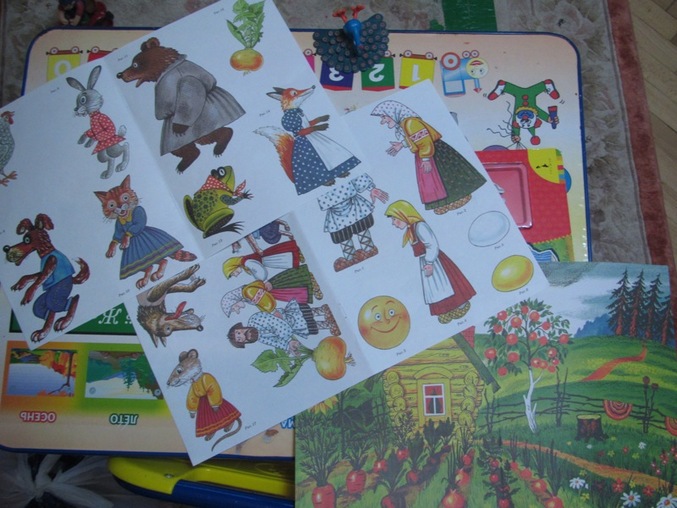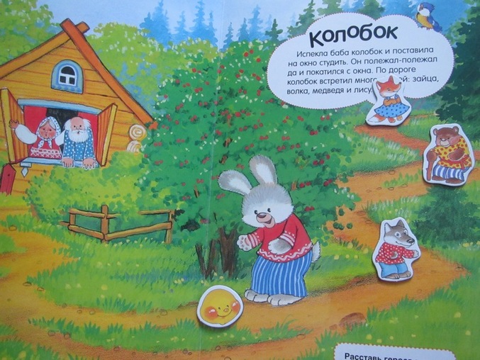 у нас вот такой вариант, Книжка, в которой несколько сказок. Нужно расположить всех героев и рассказать сказку