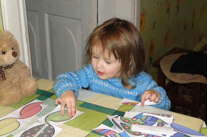 Занимались по печатным заданиям: тренировали ручку, собирали половинки, большой-маленький, искали лишнее: