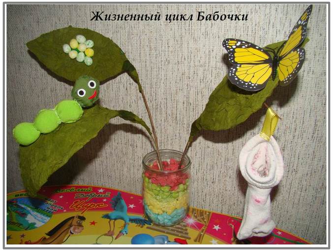 7) Жизненный цикл бабочки. Придумали с Дашей мини-сказку и разыграли ее на нашем самодельном дереве. Очень ей понравилась сказка, все поняла и запомнила. Показывали раз 20! Подробнее о сказке здесь: http://www.babyblog.ru/user/id835023/55011