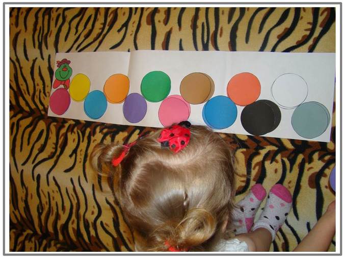 3) Восприятие цвета - помогали гусенице найти ее кружочки и раскладывали их по цветам:
