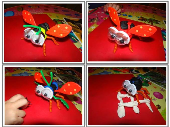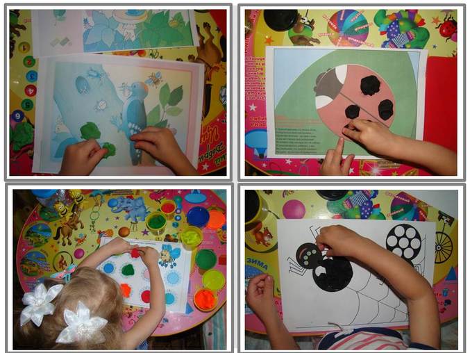 3) Пластилиновые картинки: делали точки на божьей коровке, прятали жучков под корой от дятла и помогали пчелке нектар собирать: