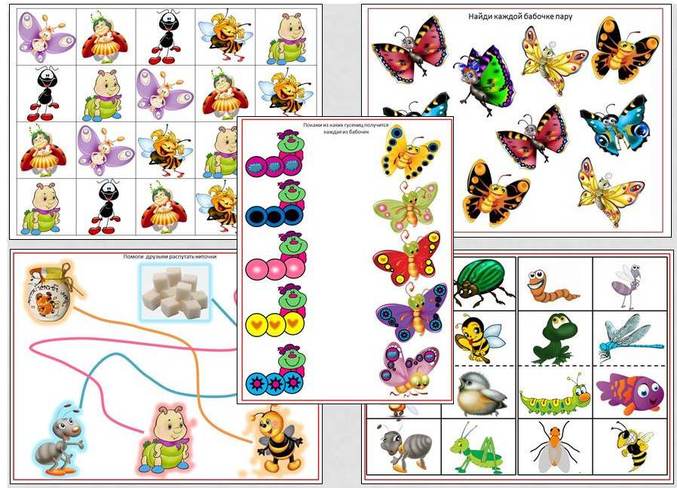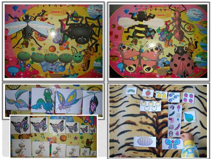 1) Задания с картинками: по росту, жизненный цикл бабочки пытались повторить, собирали насекомых из частей, раскладывали картинки по книге «Очень голодная гусеница»: