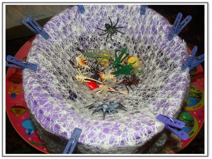 А еще играли вот с такой самодельной паутинкой (корзина для игрушек + платок):