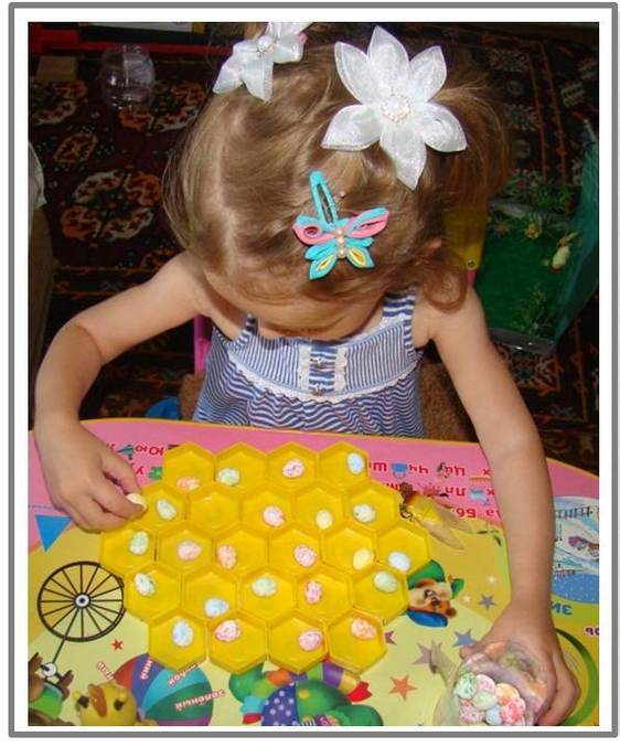 Потом вспомнили, что в пчелиной улье есть пчелиная королева, которая откладывает много яиц каждый день и разложили по сотам также и яички (предварительно смотрели мультики «Пчелка Майя. 1 серия» и «Жизнь пчелы», там это хорошо показано):