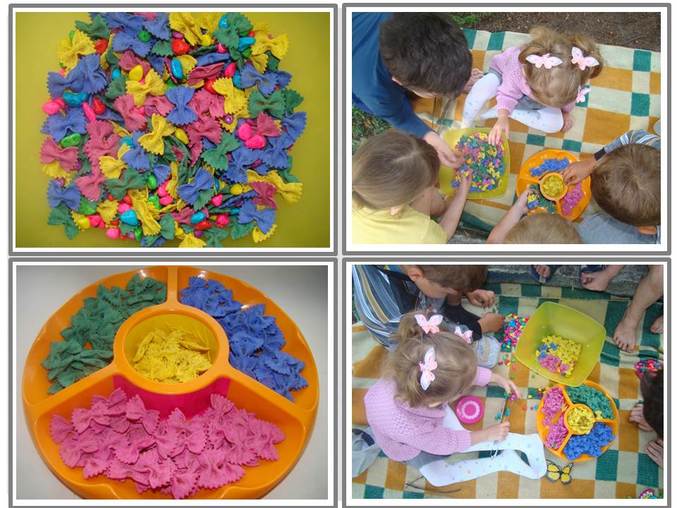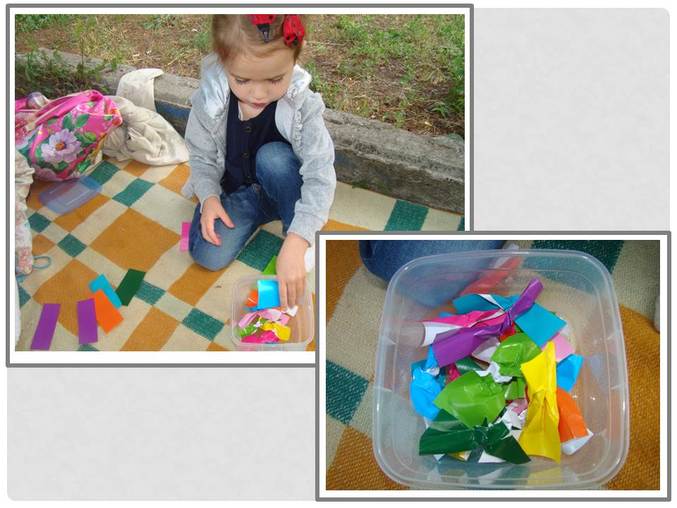 1) К нам прилетели бабочки. И мы их сортировали по цвету руками и щипцами (играли на улице, всем детям очень понравилось):