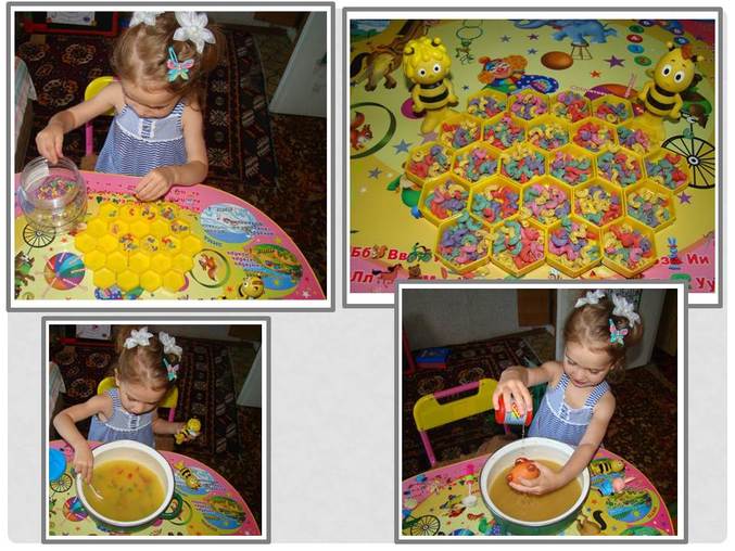 После того, как весь нектар собрали, Даша как настоящая пчелка полетела раскладывать его по сотам (соты сделала из мозаики – склеила по внешней стороне и между собой скотчем, так что мозаика не пострадала). А затем начали варить мед: Даша покрасила водичку желтой краской, побросала собранный нектар, все размешивала и угощала всех! Не забыли мы и про Винни Пуха -сейчас этот мультик среди фаворитов. Игры с водой Даша просто обожает, поэтому очень порадовалась!