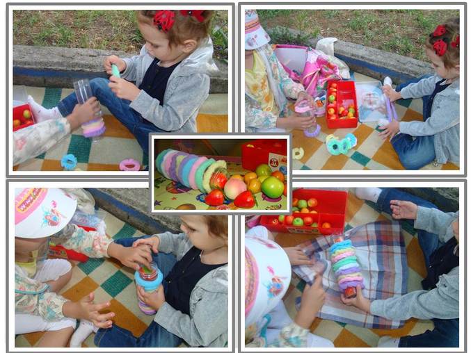 2) Обыграли жизненный цикл бабочки так: Взяли тубу и – это была наша гусеница, но наша гусеница, к несчастью, растеряла все свои кружочки. Нужно было ей помочь и вернуть их на место – надевали резиночки для волос на тубу. После этого, как и полагается любой порядочной гусенице, нужно было подкрепиться – кормили гусеницу, просовывая фрукты и овощи через горлышко. Когда наша гусеница наелась, мы заматали ее в платочек – кокон и положили спать.