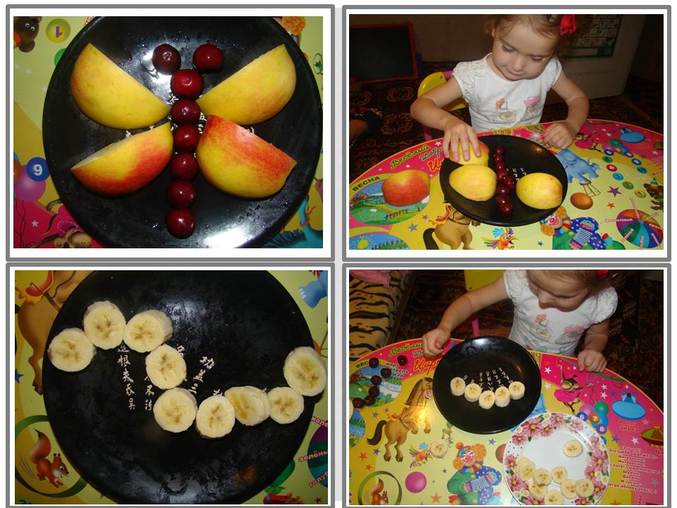 2) Выкладывала Даша бабочку из черешни и яблок и гусеничку из бананов. Очень понравилось ей это занятие. Себе на заметку взяла – летом будем чаще заниматься эти, особенно около дома – там у нас столько вишен уже поспевает!!!!
