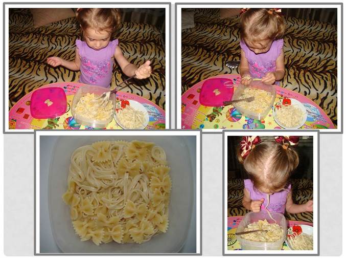 1) Поиграли с вареными макаронами – это были червячки и бабочки, мы их на вилку накручивали и не только….) Когда наигрались, пошли на улицу кошечек кормить – ой, как они нам были благодарны. Это надо было видеть!